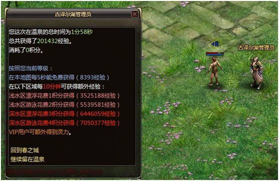 厌倦了刷怪挂机?担心被人恶意PK?想要轻松的获得经验?那就赶紧来古泽尔湖泡温泉吧。