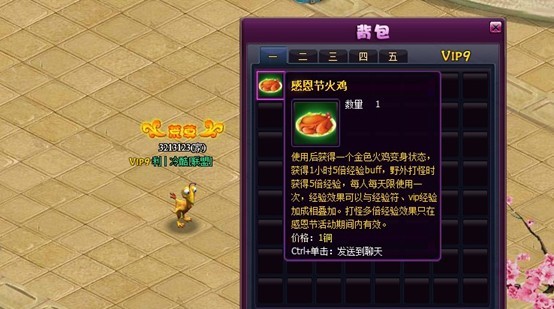 5. 感恩节火鸡(商城购买感恩节礼包可以开出)使用后获得一个金色火鸡变身状态,并获得1小时的打怪5倍经验buff,野外打怪时获得5倍经验,每人每天限使用一次,经验效果可以与经验符,vip经验加成相叠加