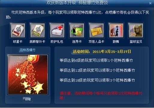 活动规则:活动期间每个账号有一次机会领取范特西爆竹,使用范特西爆竹有机会获得饭票、人品、道具等各项奖励。