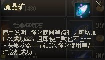 8、一件装备前12次强化,每次都放入5个精炼黑铁矿或者1个魔晶矿的话,则强化的成功率是百分百。放入黑铁矿则有几率强化失败。
