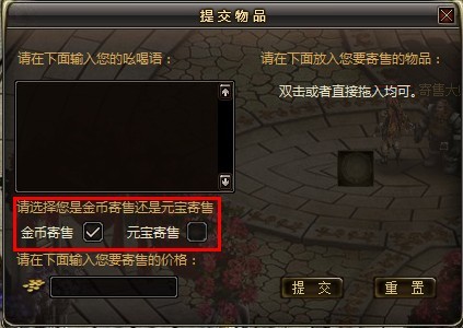 同样,金币寄售或者元宝寄售一个件物品只能选择一种寄售方式。